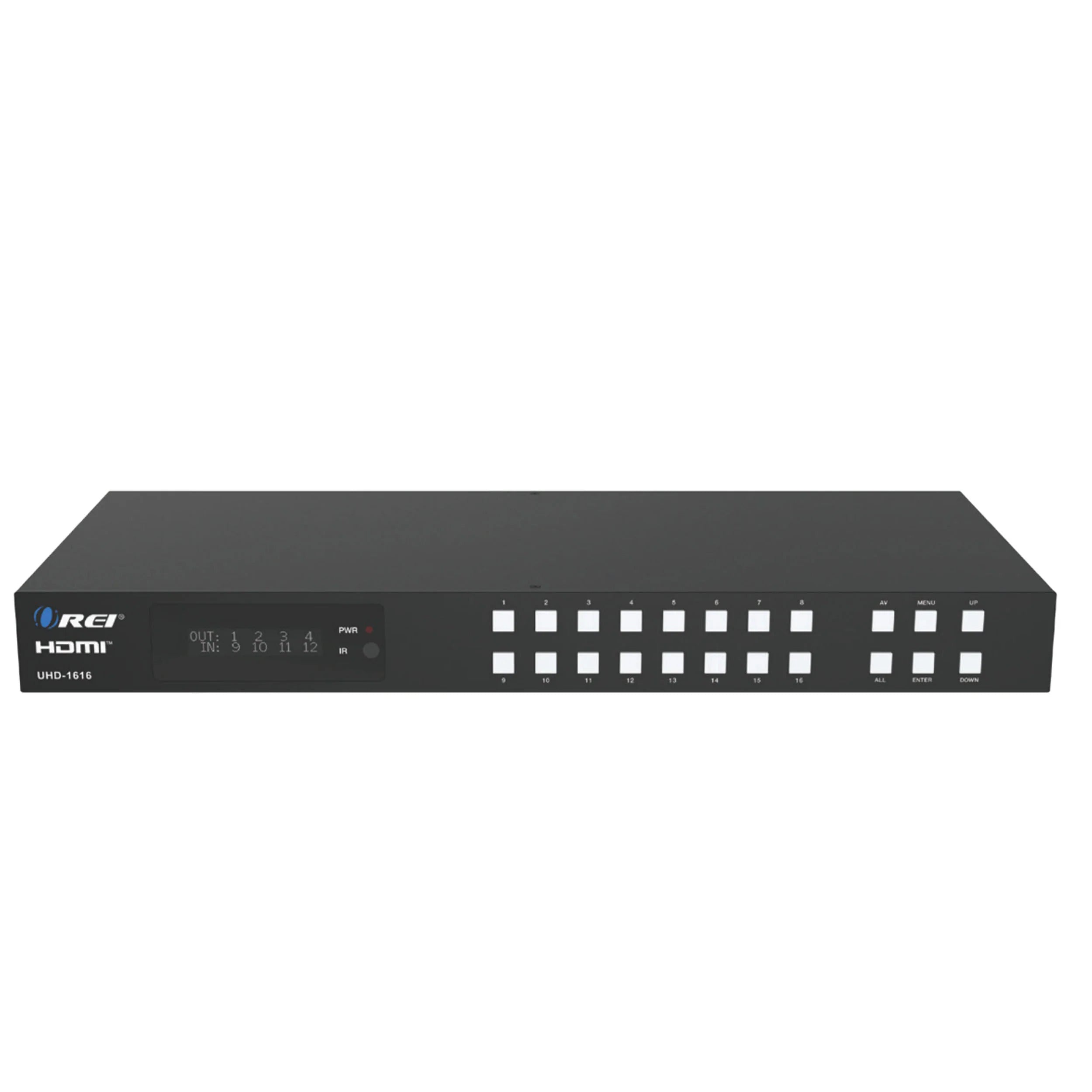 UHD-1616 is a professional-grade video distribution solution, designed to route ultra-high-definition video and digital audio from up to 16 HDMI™ sources to 16 HDMI™ displays simultaneously. Supporting resolutions up to 4K@60Hz (YUV 4:4:4) and featuring 18Gbps bandwidth, this matrix switch ensures uncompressed, high-performance signal delivery across all outputs. Each HDMI™ output supports independent downscaling from 4K to 1080p, allowing seamless integration with mixed-resolution displays. Built-in audio extraction provides a coaxial output for each HDMI™ output, and ARC (Audio Return Channel) functionality enables ARC audio extraction from compatible displays.