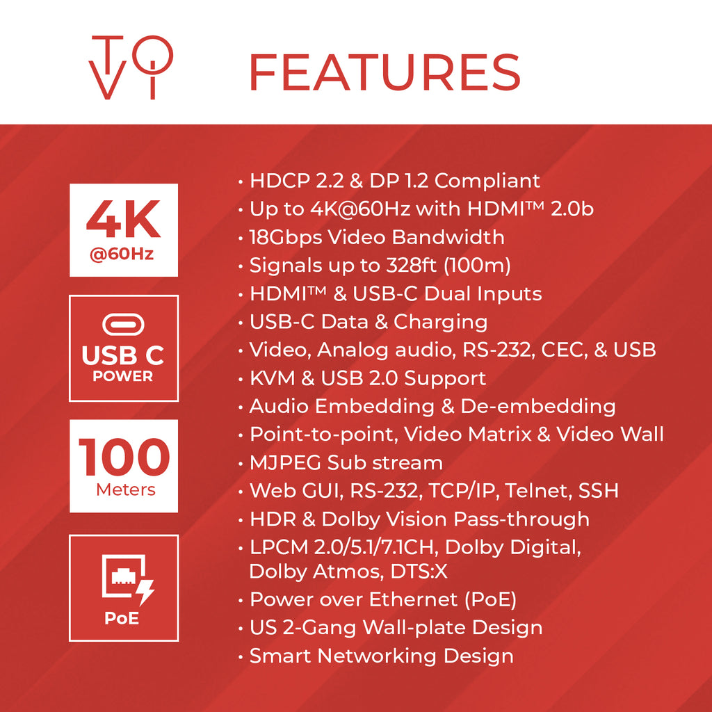 - Full Signal Transmission Over IP – Transmits video, analog audio, RS232, CEC, and USB signals over Ethernet.