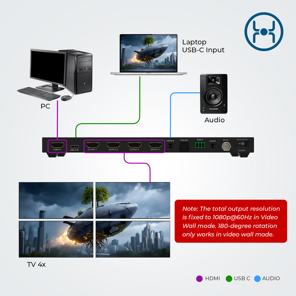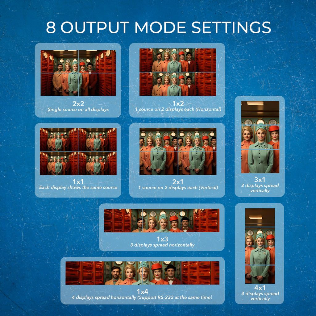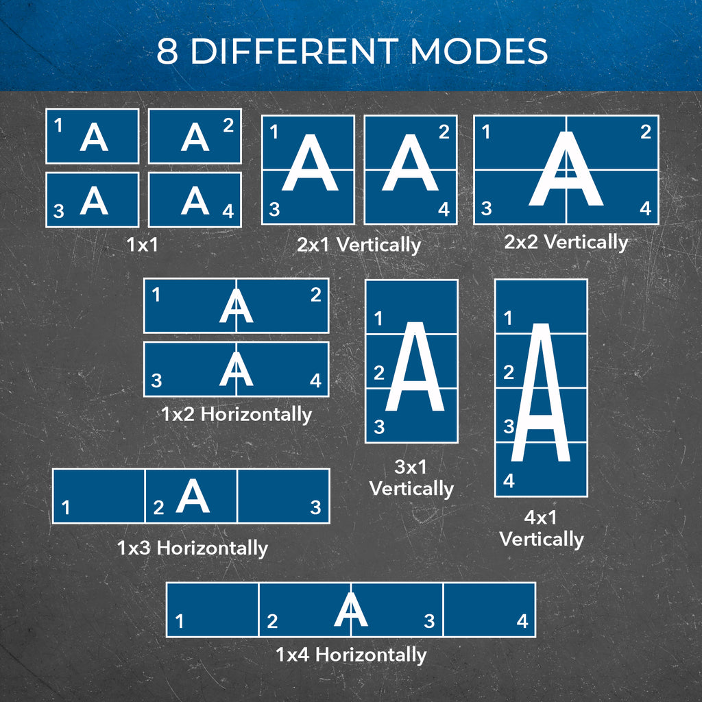 - 1 Input 4 Output for a 2x2 video wall setup.