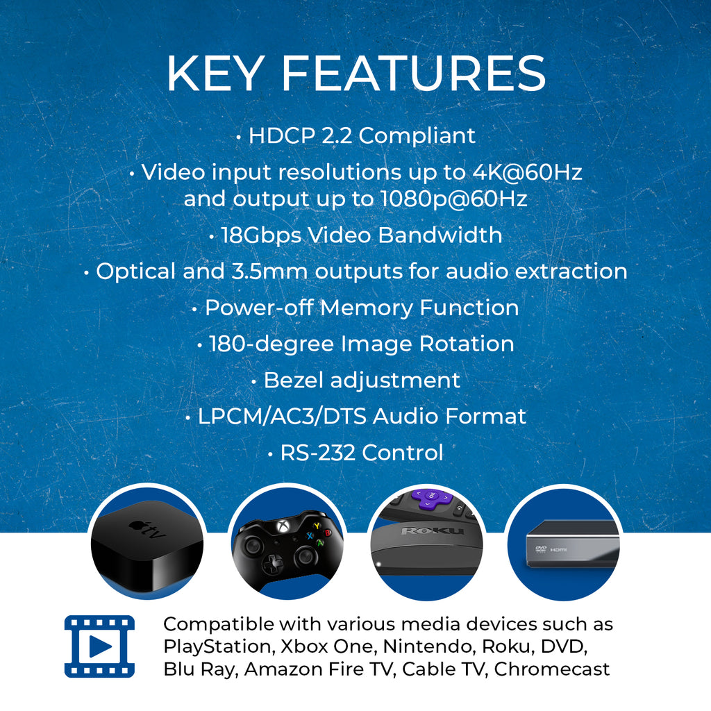 - HDMI 1.4 and HDCP 1.4 compliant with resolutions up to 1080p@60Hz.