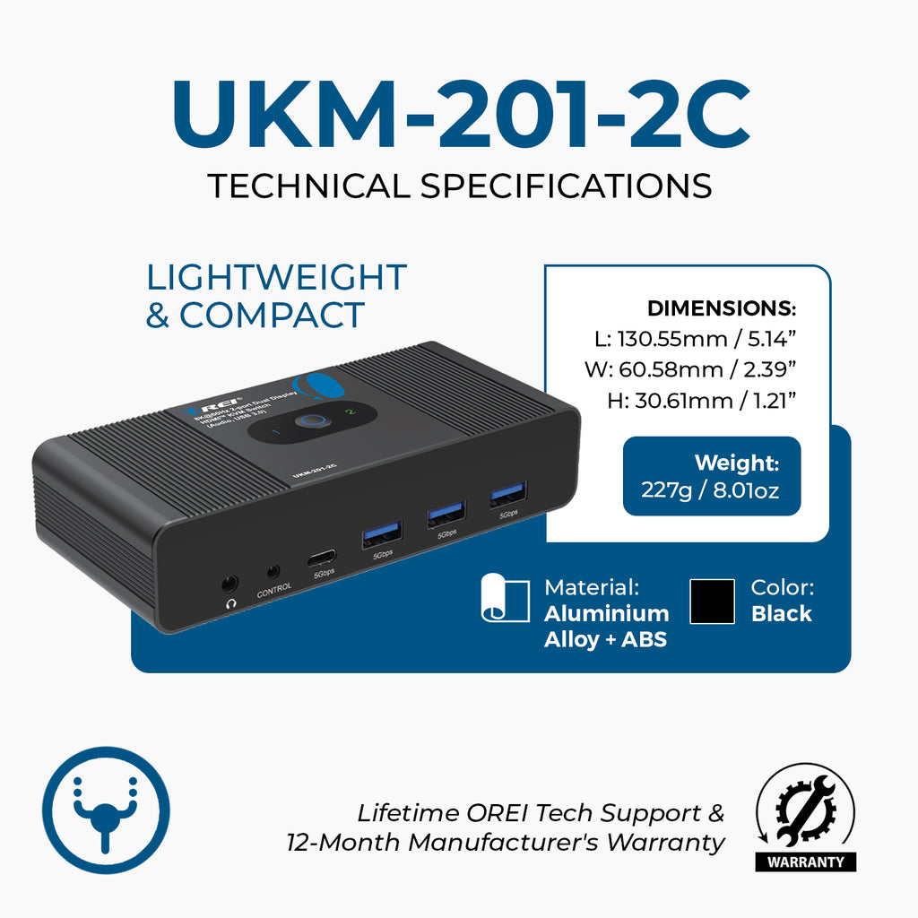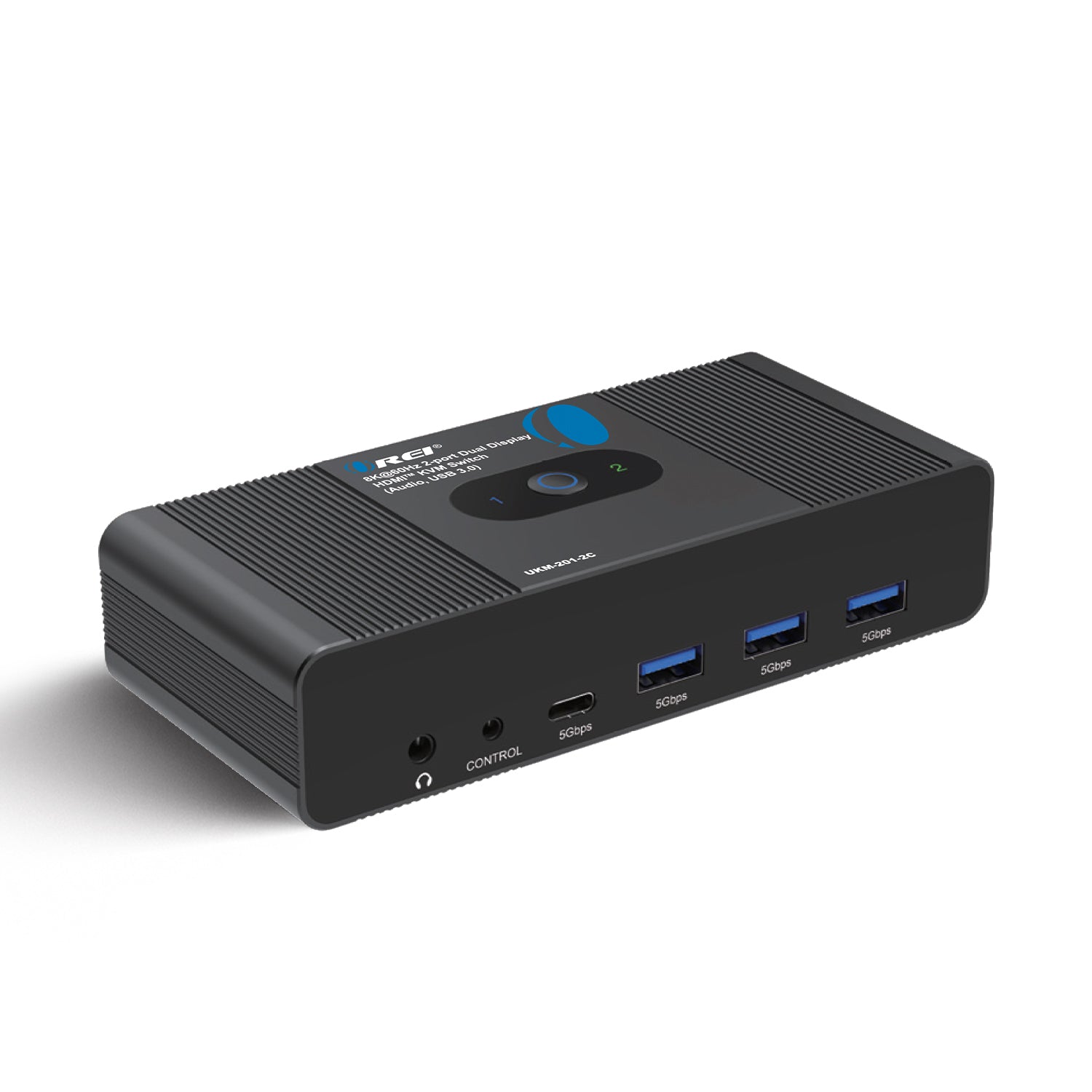 The UKM-201-2C is a high-performance 8K HDMI KVM Switch that lets you control two computers using one set of peripherals and dual external displays. It supports dual HDMI 8K@60Hz (YUV 4:4:4) with HDR10, HDR10+, Dolby Vision, HLG, 3D at 1080p, and HDCP 2.3. The dual HDMI outputs support Extend Mode (MST) for running different content on two screens. It features 12-bit Deep Color, 48Gbps bandwidth, CEC, and advanced audio including Uncompressed LPCM, and Compressed Dolby TrueHD, and DTS-HD Master Audio over HDMI. Supported resolutions also include 4K@120/144/165Hz, 2K@60/120/144/165Hz, and 1080p@120/144/165/240Hz. With three USB-A 3.0 ports and one USB-C 3.0 device port, it allows fast (5Gbps) sharing of keyboards, mice, SSDs, touchscreens, and other peripherals between both systems. A 3.5mm stereo audio output is included for flexible monitoring with speakers or headsets.