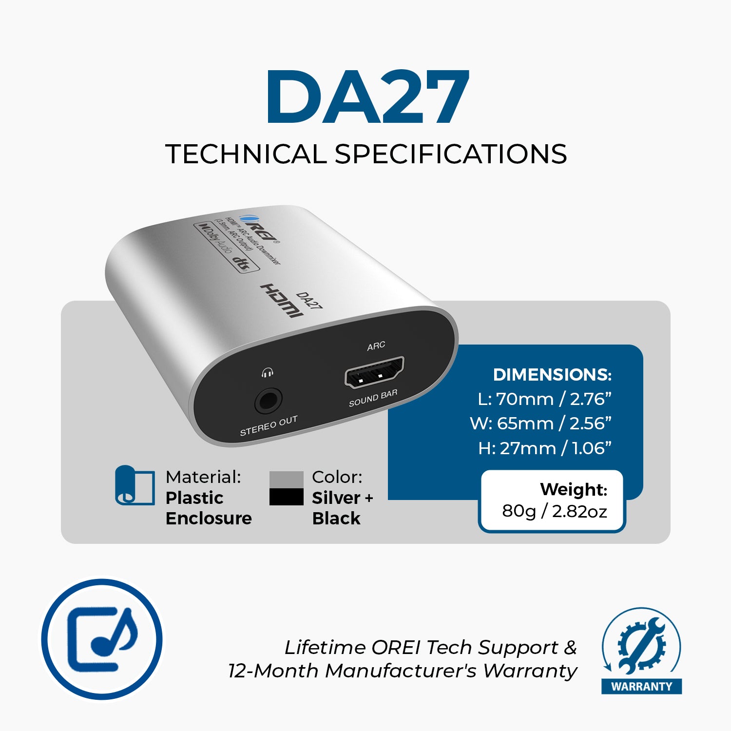 Equipped with CEC functionality, the device allows users to conveniently control the connected ARC soundbar's volume using the TV remote, simplifying operation and en-hancing user experience. Designed for versatility and ease of use, the DA27 delivers high-quality sound reproduction for modern home entertainment systems.