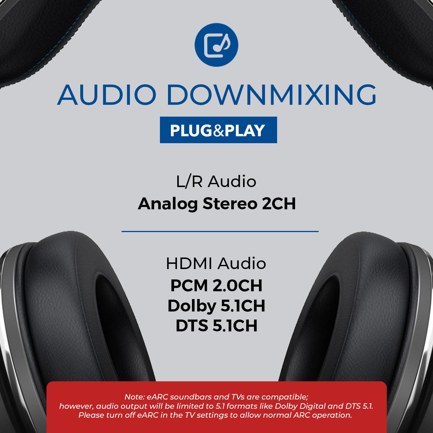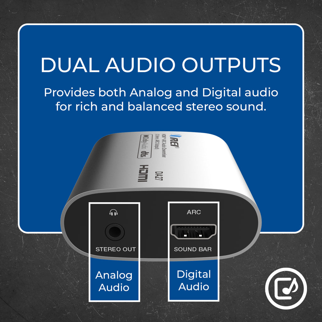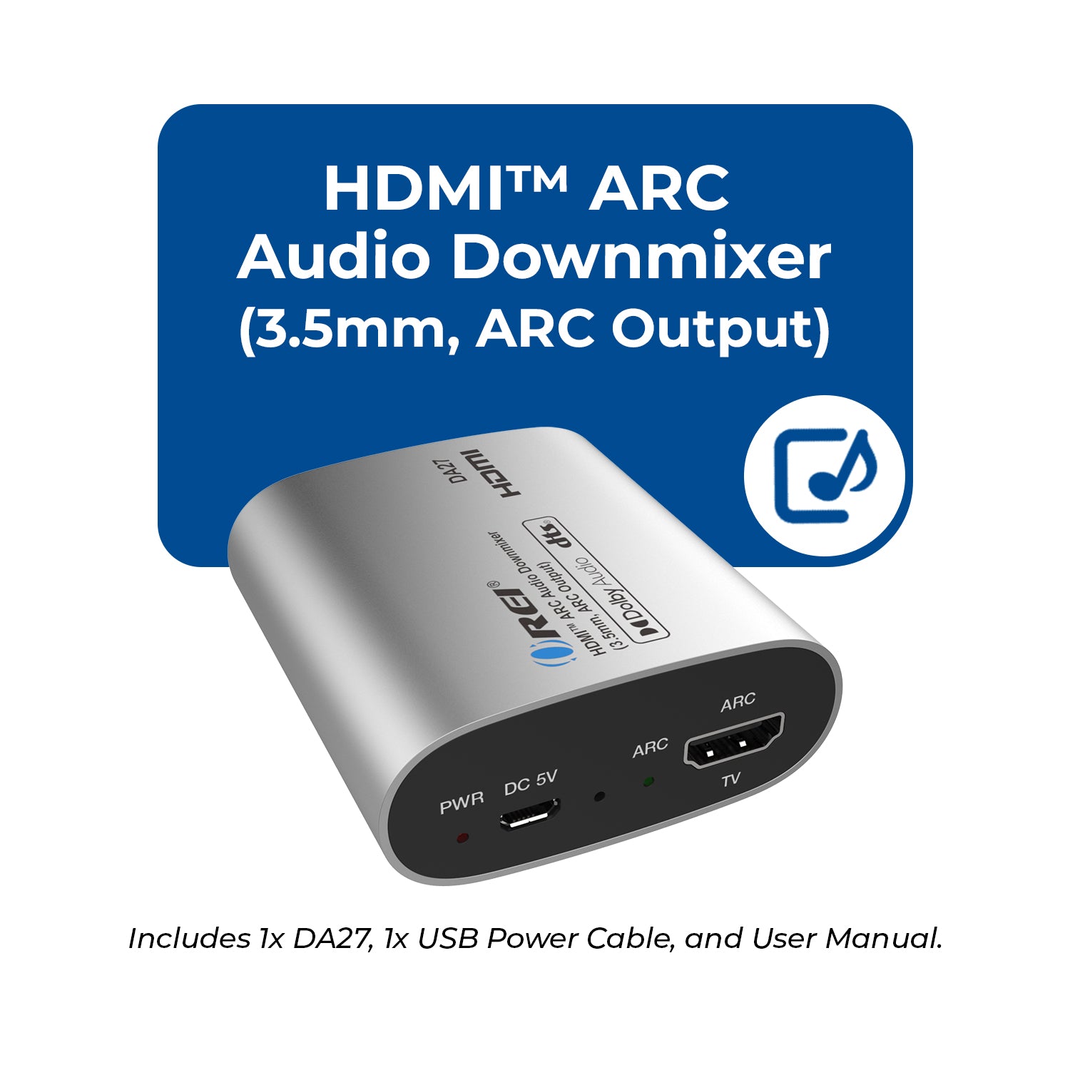 DA27 is a compact and high-performance audio down-mixer designed to extract and convert audio from ARC-enabled TVs. It outputs 2-channel analog stereo audio via 3.5mm output and digital audio through HDMI™ ARC, making it ideal for connecting ARC soundbars or AVRs along with analog audio devices like headphones. Supporting Dolby 5.1 and DTS 5.1 audio down-mixing, it ensures rich, balanced stereo sound without loss of clarity.