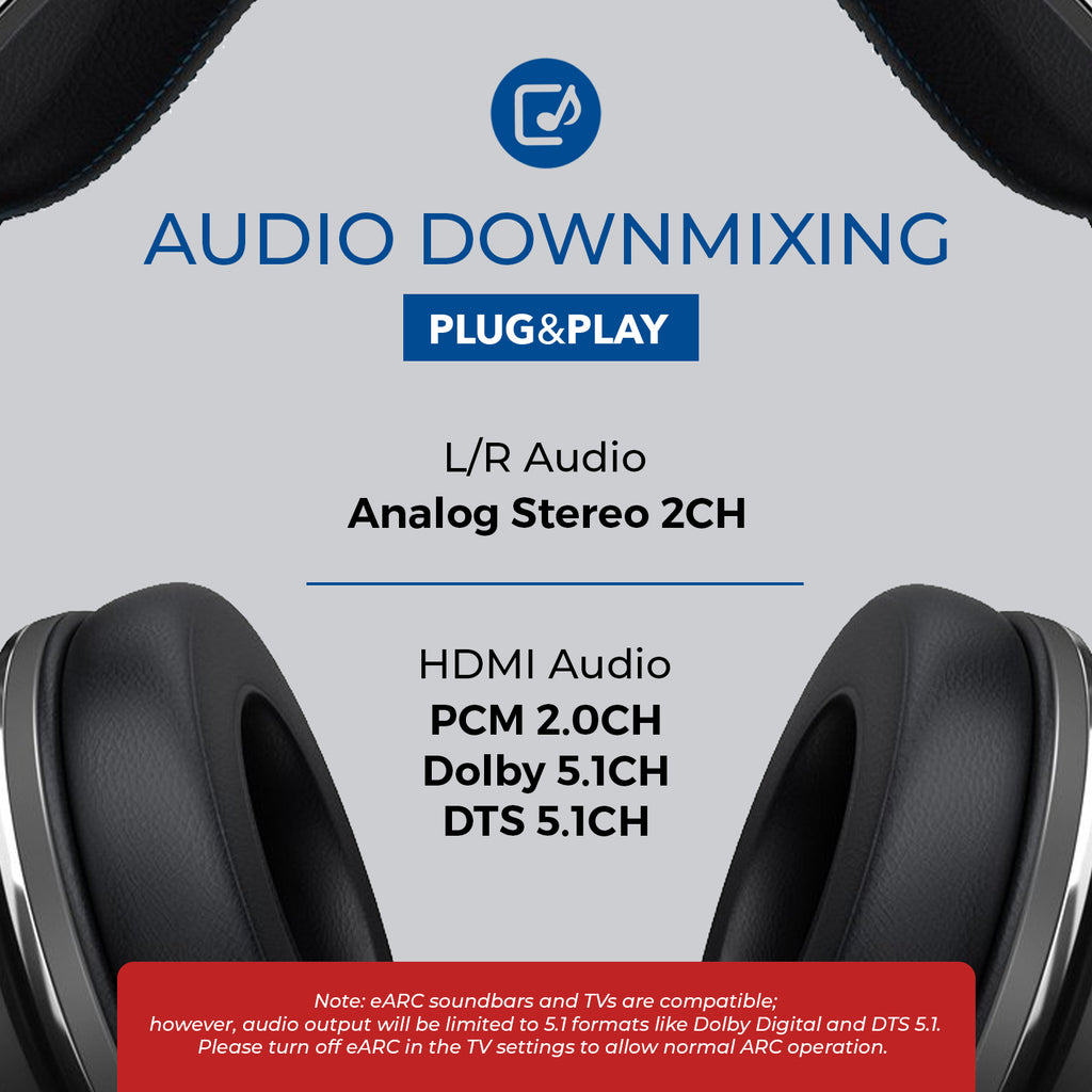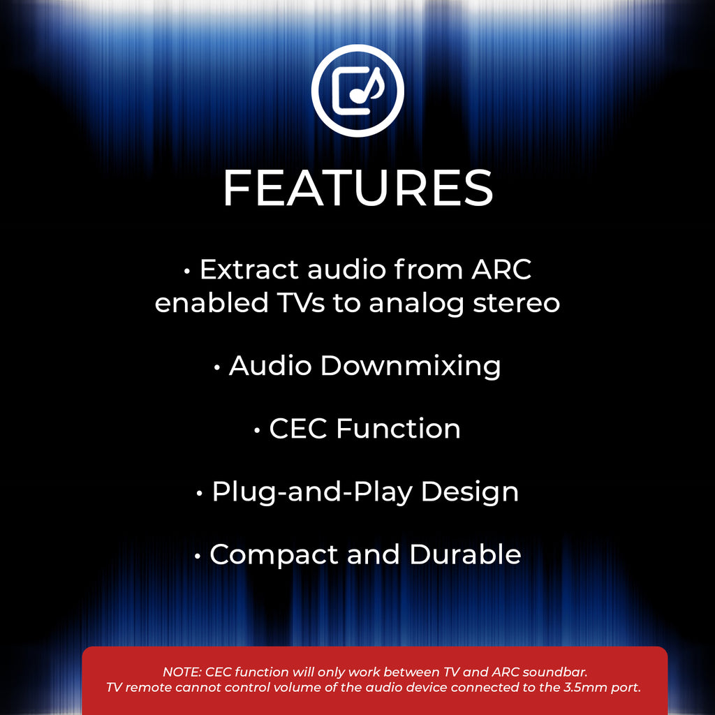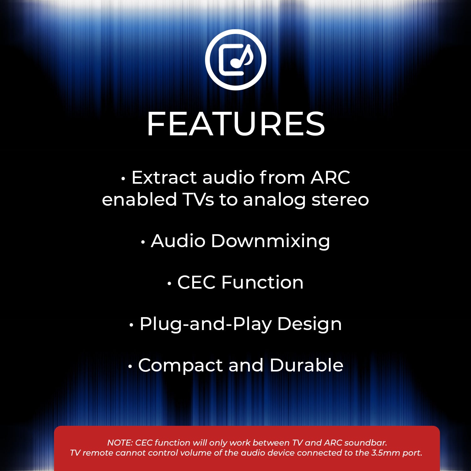 - ARC Enabled - Extracts audio from ARC-enabled TVs to analog stereo and HDMITM ARC output simultaneously.