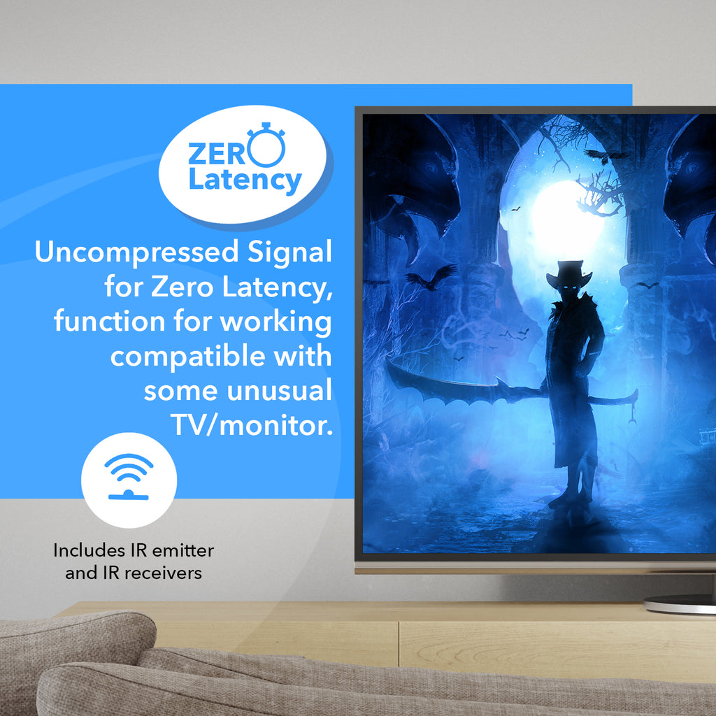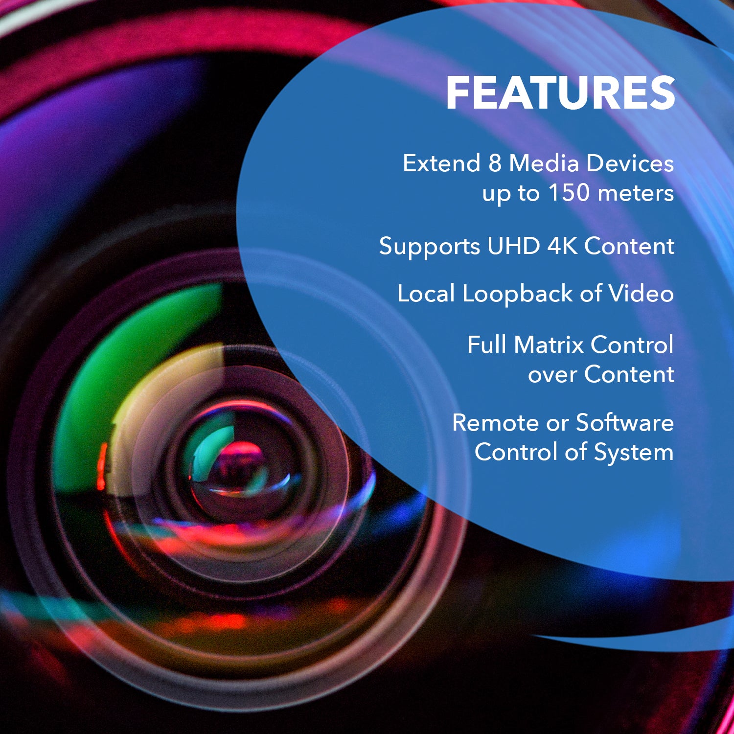 Control options include front panel buttons, IR remote, RS-232, LAN, and WebGUI, with advanced EDID management, CEC support, and Power over Cable (PoC) technology for streamlined installation. The UHD88-EXB300-K is built for professional-grade AV routing in commercial, educational, and digital signage applications.