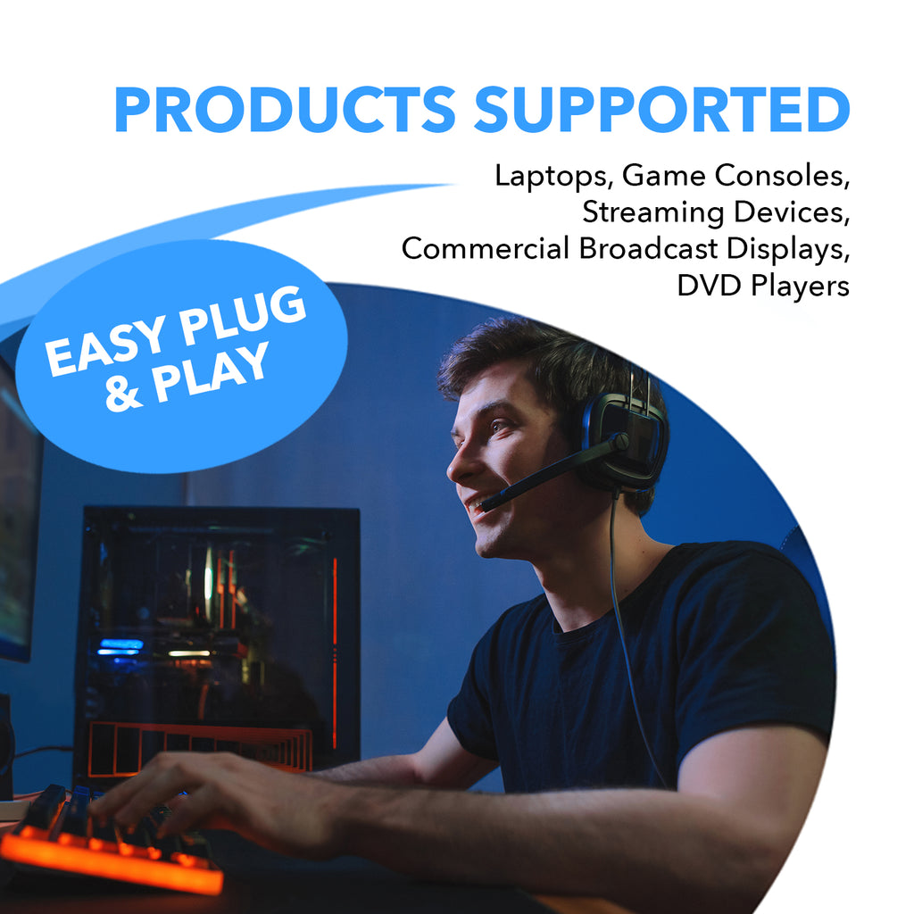 Each HDBaseT output extends video signals up to 300 feet over a single CAT5e/6/7 cable. The matrix includes independent 4K-to-1080p downscaling per output, along with support for HDR10, HDR10+, Dolby Vision, and HLG. Audio extraction is available via both analog and coaxial outputs.
