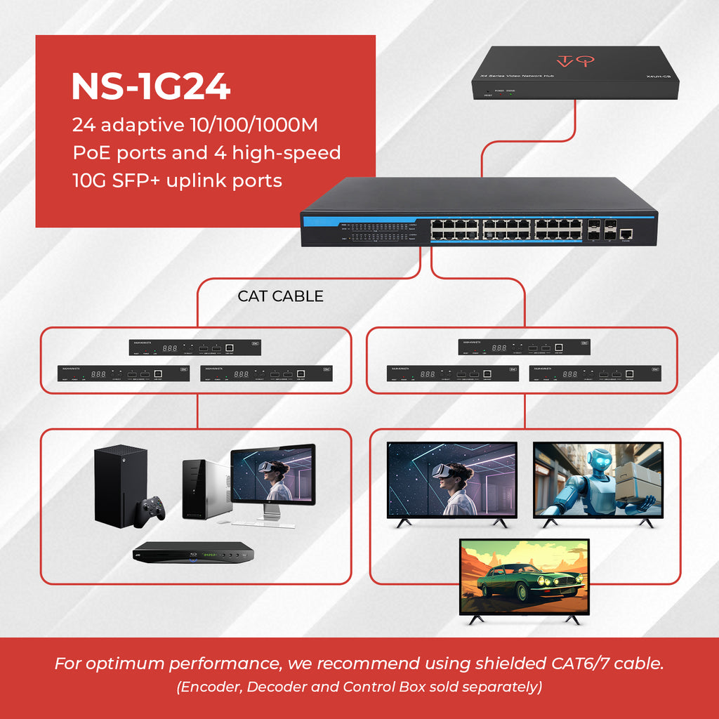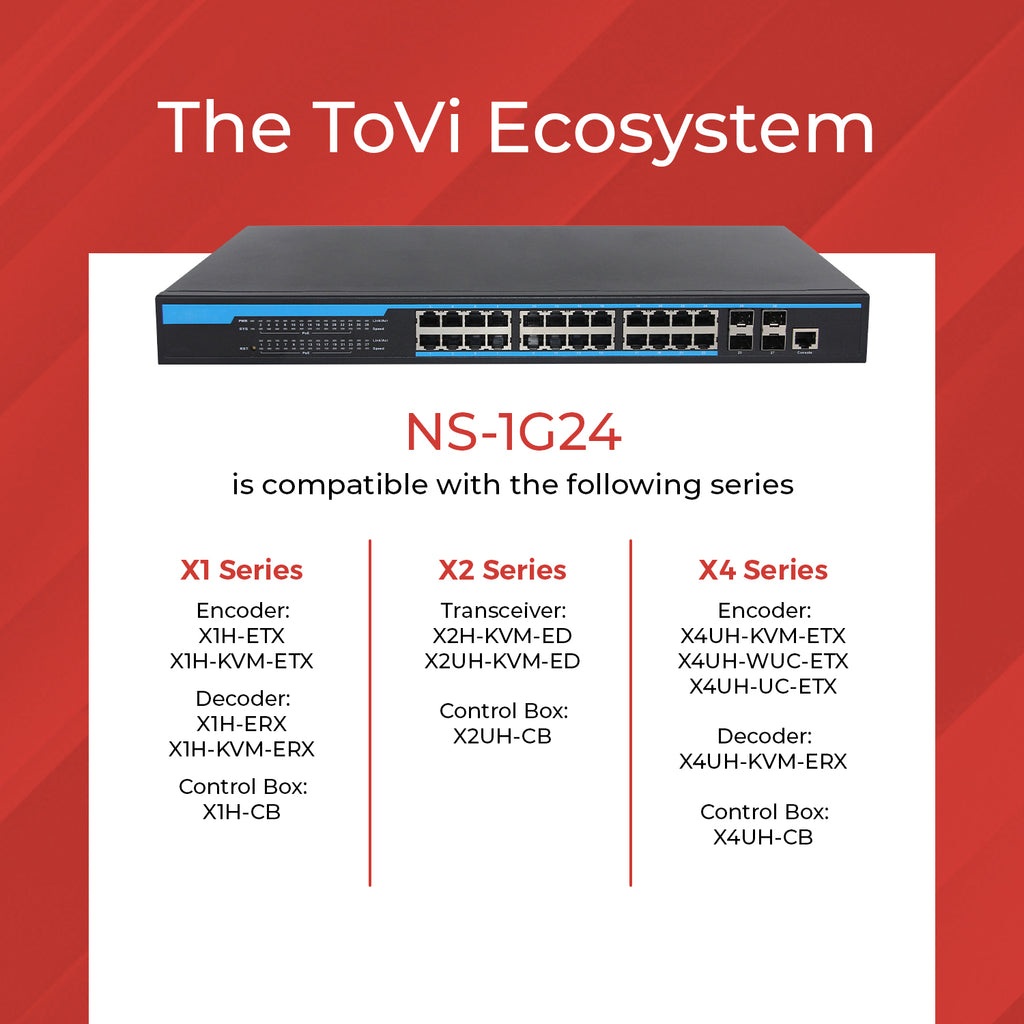 The built-in web-based management interface allows for flexible network control, while PoE support simplifies deployment of IP cameras, wireless access points, and other AV devices like the ToVi range of products by OREI. The NS-1G24 is completely compatible with and made specifically for ToVi’s X1, X2, and X4 series of products.