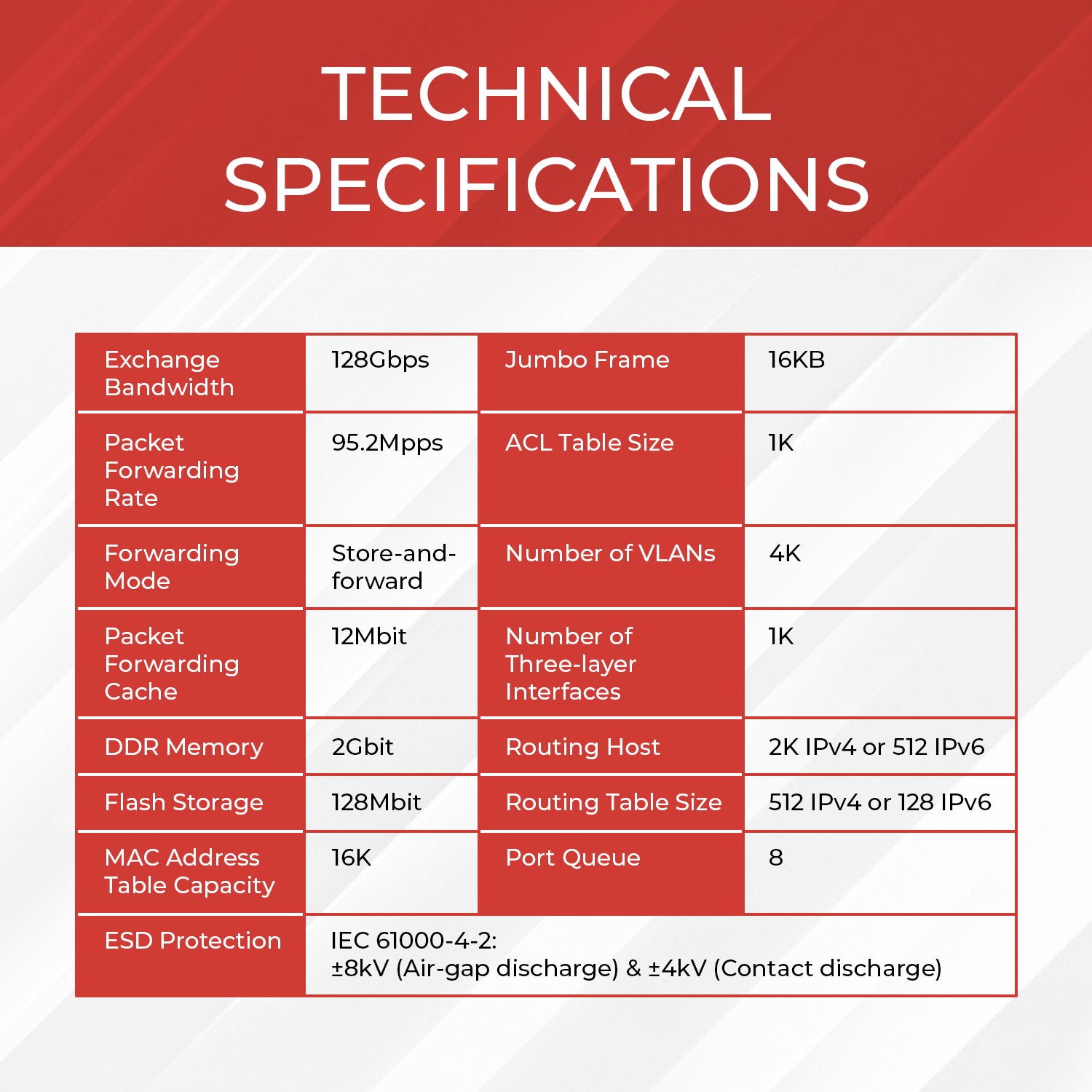 - MAC Address Table Capacity: 16K