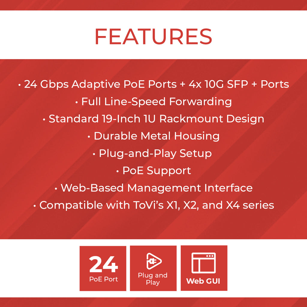 ToVi 24-Port Gigabit PoE Switch w/ 4×10G SFP+ Uplink (1U Rackmount)