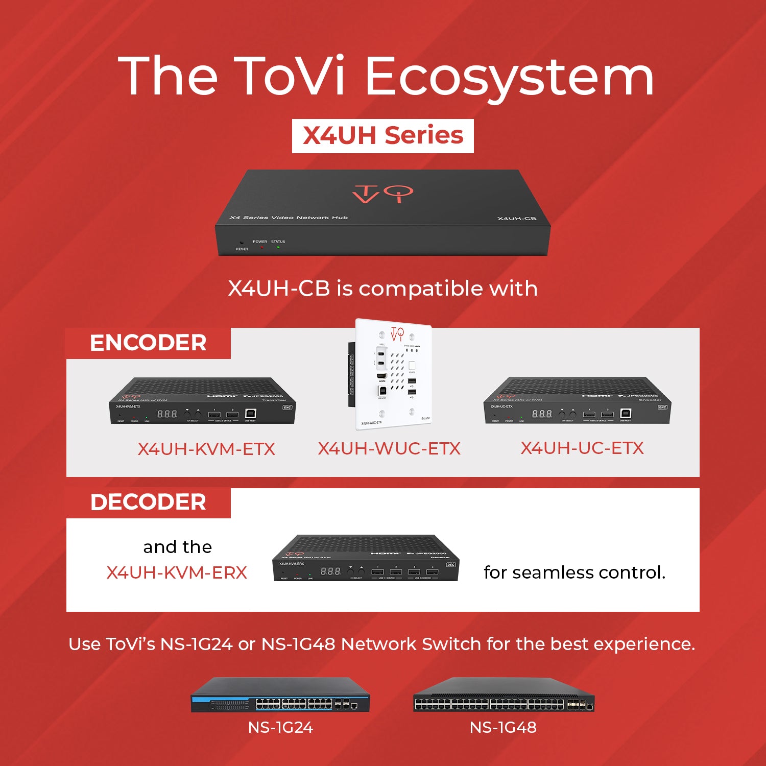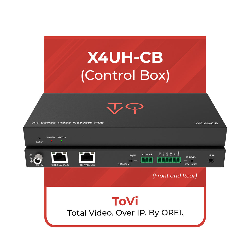 The X4UH-CB is a high-performance video network hub designed to manage and control distributed AV systems utilizing the ToVi X4 Series models. Featuring dual network ports for dedicated control and multicast video traffic, it ensures efficient and secure network isolation while delivering exceptional performance and reliability.
