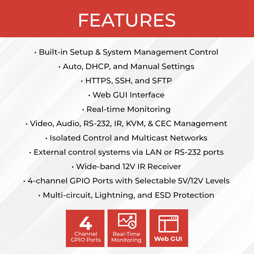 - Full System Control – Supports video, audio, RS-232, IR, KVM, and CEC management on X4 Series Extenders